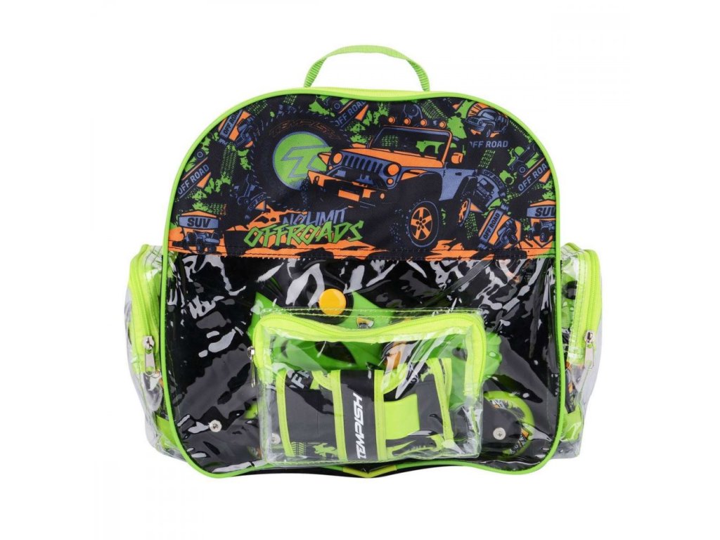 Set obsahuje 1 pár kolieskových korčúľ, prilbu, 3-sadu chráničov (kolená, lakte, zápästia), všetko v praktickom batohu na chrbát. Korčule majú jednoduchý a pohodlný systém nastavenia veľkosti. Korčule možno nastaviť na 4 veľkosti. Kolieskové korčule možno nastaviť na stabilnejšiu variantu a to zdvojnásobením zadných koliesok, každé balenie obsahuje aj tzv. dlhú osku. Pri veľkostí korčľ XS, S sú pre krátky podvozok len 3 kolieska CATCH 64x24mm 82A.